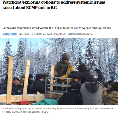 On January 23, 2023, the CBC’s Brett Forester reported on the RCMP’s federal watchdog contemplating an investigative probe on the RCMP’s Community-Industry Response Group (C-IRG).